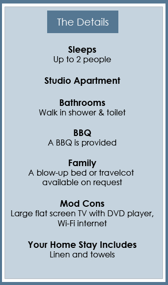The Apartment The immaculately presented accommodation has an open plan living and sleeping area comprising of a king size bed with memory foam mattress, comfortable sofa, tv, dvd player & wi-fi. There is a well equipped kitchen/diner with oven/grill, hob, microwave, fridge freezer, kettle and toaster. A modern tiled bathroom with walk in shower and heated towel rail and all linen provided. To the side of the property for guests use are chairs, table and a BBQ. Secure storage for bicycles is on hand. The studio is attached to the owner's own home and is available all year round. There are no fixed start days for both holidays and short breaks so you can choose what's best for you. As the owner lives on site the highest possible standards are ensured and flexible arrival times are available.